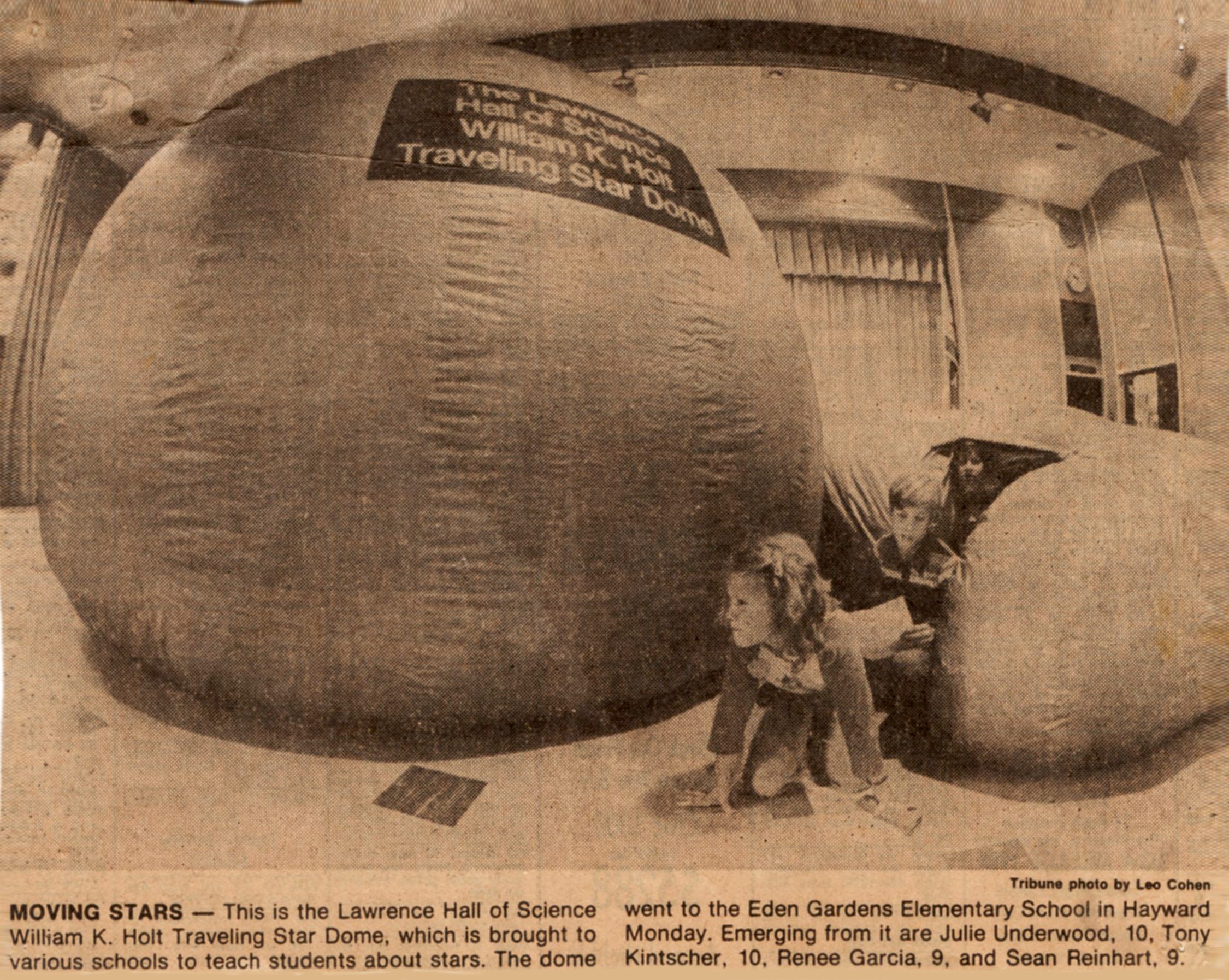 One day Mrs. Fenton brought a giant bubble to the school. It was a traveling planetarium, inflated by a box fan. We were going to learn about the constellations in the night sky, and how explorers used them to navigate their way across the dark and mysterious seas. We all got down on hands and knees and crawled in through a tube and into the pitch darkness of the bubble. Mrs. Fenton crawled in behind us. Once inside, we all sat around the edge of the bubble, giggling while Mrs. Fenton set up the projector. The box fan enveloped us in a low humming sound. She told a story about an ancient mariner while she worked the machine. Then all at once a burst of light, and the dome above was filled with thousands of scintillating stars. Mrs. Fenton used a special flashlight that made a red arrow in the sky, to show us where to look.