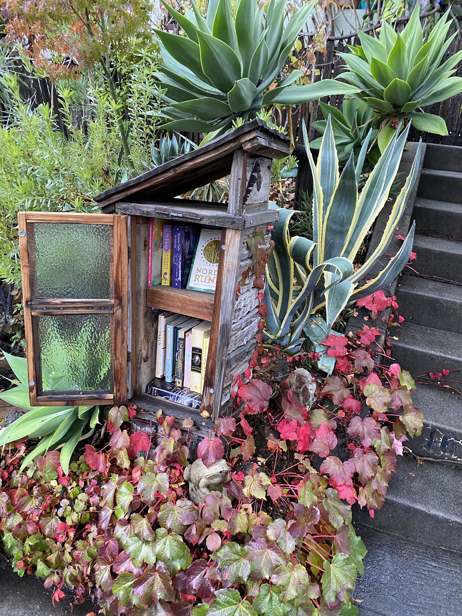 I finished the project right before the pandemic shelter-in-place orders came down. Many books and seeds and yarn and other odds and ends passed through this little library in those first unusual weeks, then months, and ever since. I enjoyed creating it (Michele was right!), and the joy it brings the neighborhood warms even this old curmudgeon’s heart.
